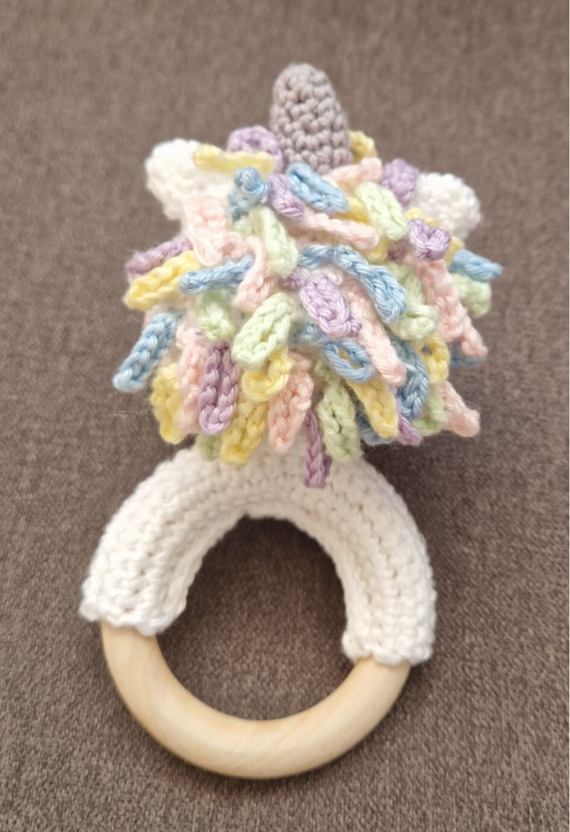 Unicorn gehaakt in katoen met rammelkraal hij kost 7,50