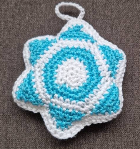 deze kerstengel is gehaakt met katoen maar ook met glittergaren. Zij heeft een zilveren kroontje op. Kost 7,50