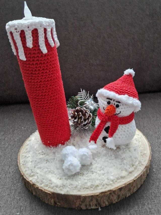 rode kaars met led verlichting en sneeuwpop op een plank 9,50