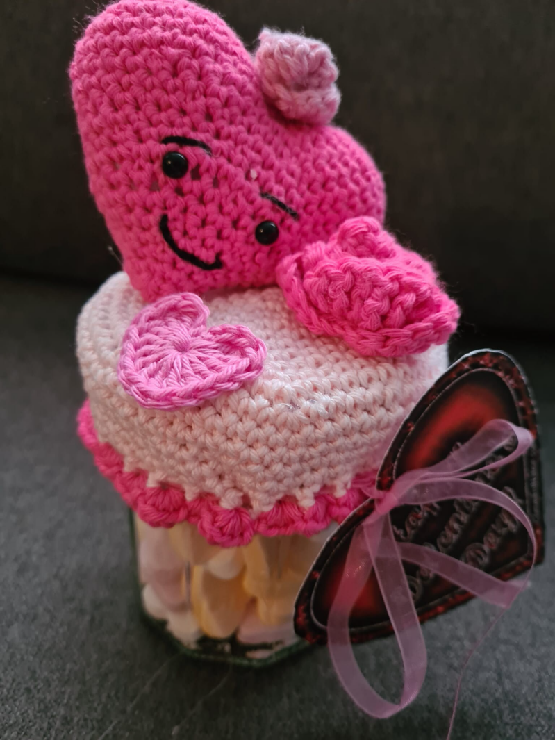 dit potje voor Valentijnsdag heb ik gemaakt van verschillende patroontjes en die gecombineerd. Hij kost 4,75