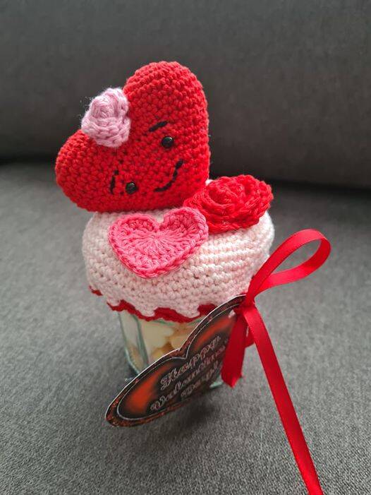 ook dit potje voor Valentijnsdag heb ik gemaakt van verschillende patroontjes en die gecombineerd, hij is met andere kleuren. Hij kost 4,75